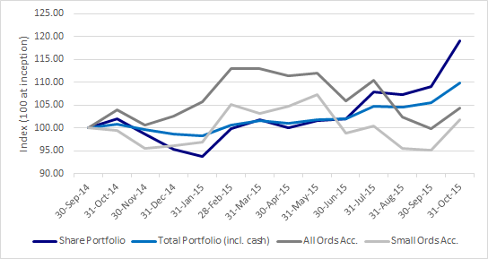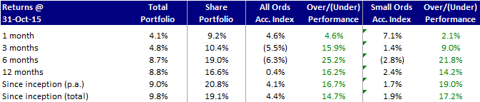 From early 2015 to the end of October 2015, my portfolio benefited from much better trading results from the mining services and mining-related basket (hopefully they have hit the bottom) as well as a continuation of the good performance of the rest of my portfolio. The banks and commodity players struggled during this time, which significantly impacted the performance of both indices, but in particular the All Ordinaries Accumulation Index. Overall for the first year, I significantly outperformed the benchmarks, with almost all of the outperformance in the second half of this period. Given that it was only a one year period, I wouldn’t read too much into it. I will judge myself over much longer periods of time, but I would be lying if I said that it didn’t feel good to be ahead of the benchmarks after one year.